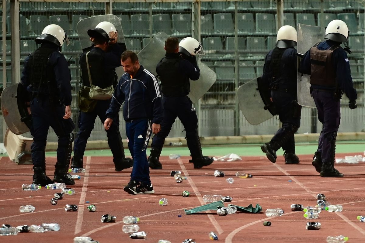 Αργότερα, μεγαλύτερη ομάδα ατόμων, έξω από το γήπεδο, κινήθηκε απειλητικά κατά αστυνομικών -εκσφενδονίζοντας αντικείμενα (πέτρες και φωτοβολίδες ευθείας βολής)- με αποτέλεσμα να απειληθεί η σωματική ακεραιότητα των οργάνων της τάξης και να προκληθούν ζημιές σε υπηρεσιακό λεωφορείο της ΕΛ.ΑΣ.