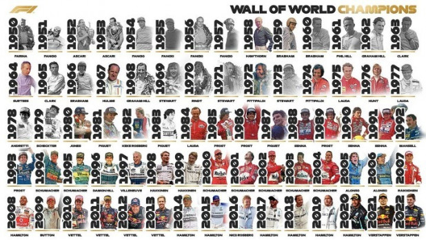 Από το 1950, οπότε άρχισε το πρωτάθλημα της Φόρμουλα Ένα, έως σήμερα, τον τίτλο του παγκόσμιου πρωταθλητή έχουν κατακτήσει οι εξής οδηγοί: