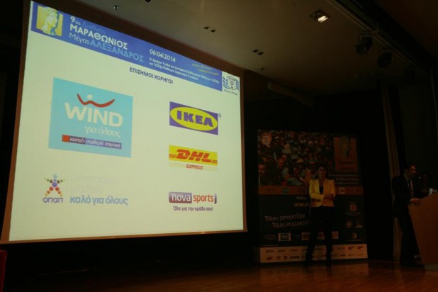 Ο διευθυντής μάρκετινγκ της διοργάνωσης, Γιώργος Τζέτζης, αναφέρθηκε στους επιχειρηματικούς συνεργάτες - χορηγούς του 9ου Διεθνούς Μαραθωνίου «ΜΕΓΑΣ ΑΛΕΞΑΝΔΡΟΣ», που συνολικά φτάνουν τους 25 σε αριθμό, με προεξάρχοντες τoν Επίσημο Χορηγό και Ονομαστικό Χορηγό των 5.000μ. και 10.000μ., WIND , καθώς και τους Επίσημους Χορηγούς ΙΚΕΑ, DHL και Novasports. Επιπλέον, τόνισε ότι κατά το τριήμερο 4-6 Απριλίου θα πραγματοποιηθεί στην Πλατεία Λευκού Πύργου η «Marathon Expo», που δίνει στους χορηγούς και σε άλλες εταιρείες την ευκαιρία να προβάλουν τα προϊόντα τους.