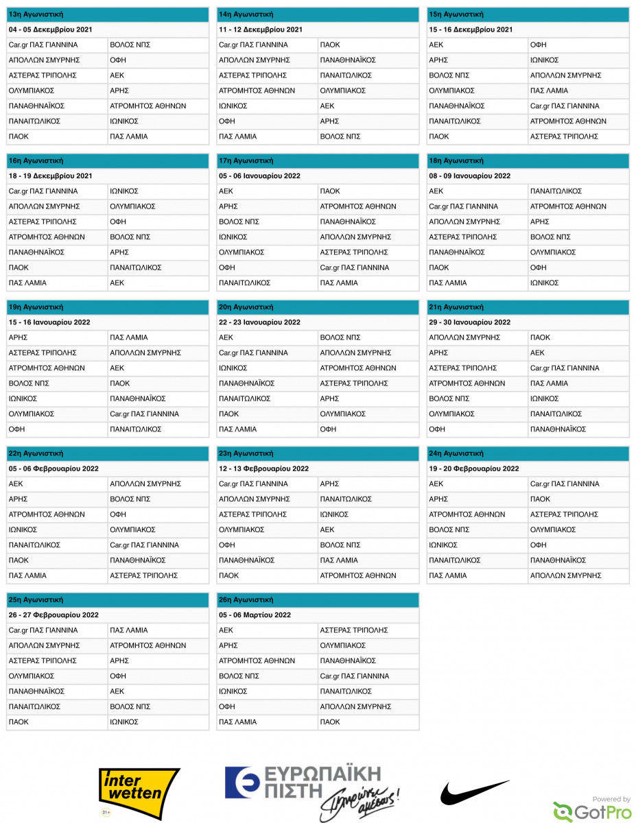 ΤΟ ΠΛΗΡΕΣ ΠΡΟΓΡΑΜΜΑ ΤΟΥ ΦΕΤΙΝΟΥ ΠΡΩΤΑΘΛΗΜΑΤΟΣ ΣΤΟΥΣ ΠΑΡΑΚΑΤΩ ΠΙΝΑΚΕΣ: