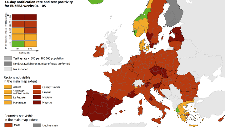 Αναφορικά με τον δείκτη θετικότητας η Ελλάδα παραμένει στο «πράσινο», δηλαδή κάτω από 4%, με τις περισσότερες χώρες της Ευρώπης να βρίσκονται στο «κίτρινο».