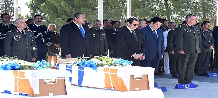 Ο υπουργός Εθνικής Άμυνας Πάνος Καμμένος που βρέθηκε στην τελετή παράδοσης των λειψάνων στην Κύπρο, απευθυνόμενος στους συγγενείς και τις οικογένειες των πεσόντων, εξέφρασε εκ μέρους της ελληνικής Πολιτείας συλλυπητήριά για τον θάνατο νέων Ελλήνων, «για τη θυσία των δικών σας ανθρώπων υπέρ βωμών και εστιών».