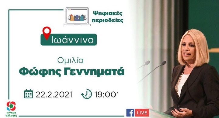 Την πρώτη διαδικτυακή περιοδεία , λόγω της πανδημίας, πραγματοποίησε σήμερα η πρόεδρος του Κινήματος Αλλαγής, Φώφη Γεννηματά. Μίλησε με τηλεδιάσκεψη με παραγωγικούς φορείς και κομματικά στελέχη των Ιωαννίνων για την Οικονομία και το Ταμείο Ανάκαμψης.