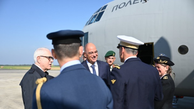 Τον κ.Δένδια συνοδεύουν ο Αρχηγός ΓΕΕΘΑ, Στρατηγός Δημήτριος Χούπης και ο Αρχηγός ΓΕΝ Αντιναύαρχος Δημήτριος - Ελευθέριος Κατάρας ΠΝ.