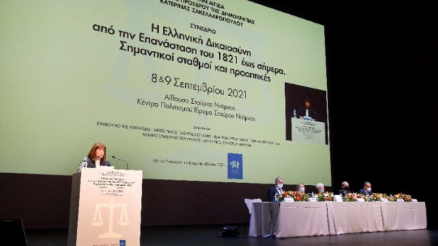 Η Πρόεδρος της Δημοκρατίας Κατερίνα Σακελλαροπούλου κήρυξε την έναρξη των εργασιών του διήμερου επιστημονικού συνεδρίου με τίτλο «Η Ελληνική Δικαιοσύνη από την Επανάσταση του 1821 έως σήμερα. Σημαντικοί σταθμοί και προοπτικές», στο Κέντρο Πολιτισμού Ίδρυμα Σταύρος Νιάρχος. Το συνέδριο συνδιοργανώνουν το Συμβούλιο της Επικρατείας, ο Άρειος Πάγος, η Εισαγγελία του Αρείου Πάγου, το Ελεγκτικό Συνέδριο, η Γενική Επιτροπεία της Επικρατείας των Τακτικών Διοικητικών Δικαστηρίων, το Νομικό Συμβούλιο του Κράτους και ο Δικηγορικός Σύλλογος Αθηνών, σε συνεργασία με την Επιτροπή «Ελλάδα 2021».