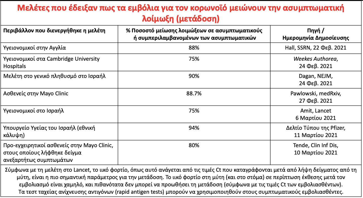 Ποσό πιθανό όμως είναι αυτό; Δηλαδή, ποσό πιθανό είναι να μείνει επαρκές ιικό φορτίο σε εμάς, έτσι ώστε να είναι δυνατόν να μεταδίδουμε άθελα μας τη νόσο; Όπως επισημαίνει ο κ. Μόσιαλος, «ξέρουμε πλέον από αρκετές μελέτες ότι δεν είναι πολύ πιθανό. Κάποιες από αυτές παρατίθενται στον συνημμένο πίνακα. Βλέπουμε δηλαδή με στοιχεία από διαφορετικές χώρες πως τα εμβόλια για τον κορονοϊό μειώνουν την ασυμπτωματική λοίμωξη και πως το ποσοστό μείωσης των λοιμώξεων σε εμβολιασμένους ασυμπτωματικούς ή συμπεριλαμβανομένων των ασυμπτωματικών, είναι τουλάχιστον 75%. Η ασυμπτωματική λοίμωξη είναι η παράμετρος που μελετάται πέραν του προφανούς λόγου και γιατί συνήθως το πολύ χαμηλό ιικό φορτίο εκδηλώνεται και ασυμπτωματικά. Πιθανότατα λοιπόν οι εμβολιασμένοι δεν μπορούν να προωθήσουν τη μετάδοση (σύμφωνα με τις τιμές Ct από τα δείγματα που ελήφθησαν από τη μύτη των εμβολιασθέντων στις μελέτες). Πάρα ταύτα, ένα 10-25% των εμβολιασθέντων, μπορεί ακόμη να μεταδίδει τη νόσο. Γι' αυτό λέμε ότι μέχρι να αποκτήσουμε ανοσία της αγέλης, συνεχίζουμε να φοράμε μάσκες».