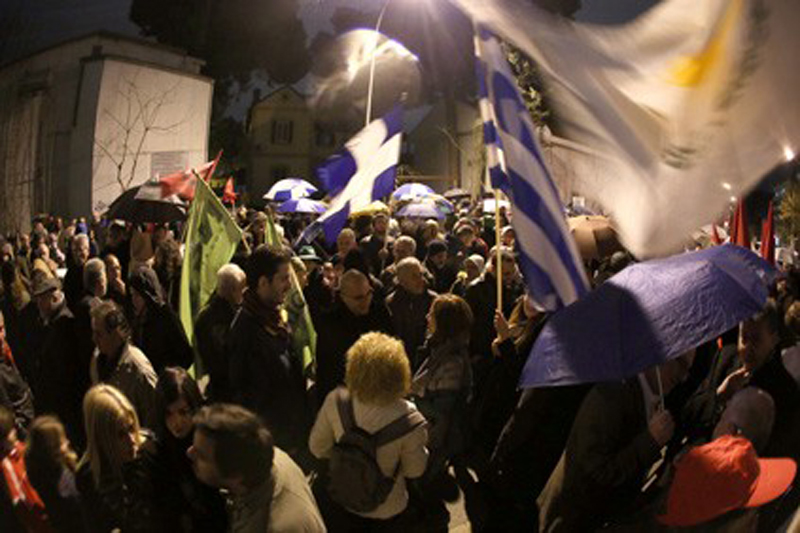 Εκατοντάδες Κύπριοι και Έλληνες που διαμένουν στην Κύπρο διαδήλωσαν απόψε υπέρ της προσπάθειας της ελληνικής κυβέρνησης στο Γιούρογκρουπ, αψηφώντας το βροχερό καιρό και το τσουχτερό κρύο.