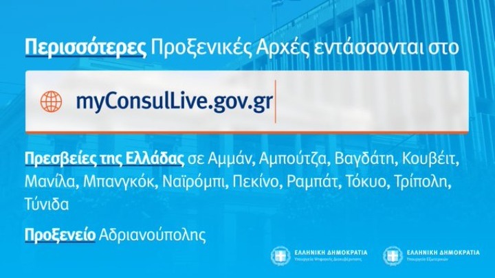 Με την προσθήκη των νέων Αρχών, η δυνατότητα εξυπηρέτησης με ψηφιακό ραντεβού διατίθεται συνολικά από 86 πρεσβείες και γενικά προξενεία σε 55 χώρες, ενώ προβλέπεται η σταδιακή επέκταση της εξ αποστάσεως παροχής προξενικών υπηρεσιών, μέσω του myConsulLive, από το σύνολο των Αρχών που διαθέτει η Ελλάδα στο εξωτερικό.