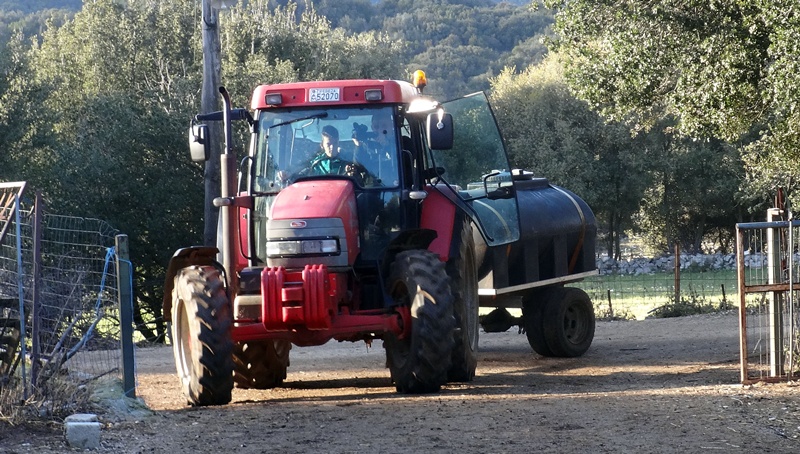 Ωστόσο, κοντά στους οικισμούς, οι κτηνοτρόφοι έχουν φτιάξει μικρές τσιμεντένιες δεξαμενές, λούτσες, όπως τις λένε, όπου συγκεντρώνουν το νερό της βροχής για να καλύψουν μερικώς τις ανάγκες για τα ζώα και να αποφύγουν τις συνεχείς μεταφορές νερού από βρύσες στα κάτω χωριά, τον Κερασώνα και την Παναγιά. Η πρώτη έκπληξη ήταν όταν, φτάνοντας στην Πάνω Παναγία, συναντήσαμε ένα 15χρονο αγόρι να οδηγεί τρακτέρ με βυτίο. Ο νεαρός σταμάτησε δίπλα σε μία τσιμεντοδεξαμενή για να πάρει νερό. Μας είπε πως καθημερινά μετά το σχολείο βοηθά την οικογένειά του, τον κτηνοτρόφο πατέρα του.
