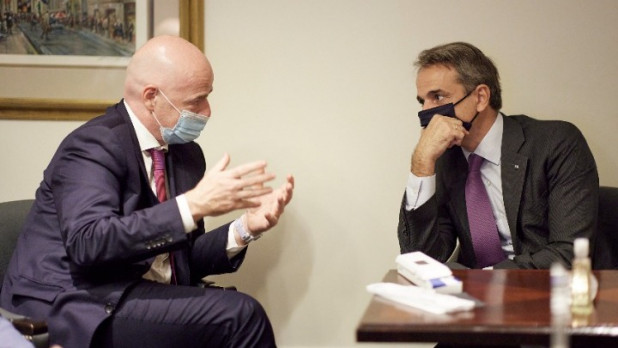Ο κ. Μητσοτάκης συναντήθηκε με τον πρόεδρο της της FIFA, Τζιάνι Ινφαντίνο, όπου συζητήθηκαν θέματα κοινού ενδιαφέροντος, αλλά και οι εξελίξεις στο ελληνικό ποδόσφαιρο. Ο κ. Ινφαντίνο δώρισε στον κ. Μητσοτάκη μια φανέλα της παγκόσμιας Ομοσπονδίας ποδοσφαίρου με τον αριθμό 9 καθώς και ένα σετ με τις χαρακτηριστικές κάρτες των διαιτητών, την κίτρινη και την κόκκινη. Από την πλευρά του, ο Έλληνας πρωθυπουργός προσέφερε στον κ.Ινφαντίνο ένα συλλεκτικό ρολόι για τα 200 χρόνια από την Ελληνική Επανάσταση.