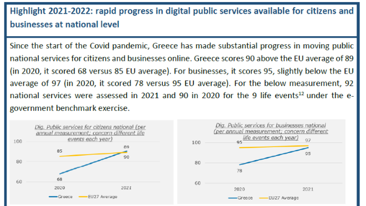 Ως εκ τούτου, και αναγνωρίζοντας το γεγονός της δυναμικής της χώρας, στην αναφορά του DESI 2022 περιλαμβάνεται έκθεση του υπουργείου Ψηφιακής Διακυβέρνησης, όπου αποτυπώνεται συνολικά το άλμα που έχει συντελεστεί. Συγκεκριμένα, αναφέρεται ότι "από την αρχή της πανδημίας, η Ελλάδα έχει καταγράψει ουσιώδη πρόοδο στην ψηφιοποίηση των δημόσιων υπηρεσιών προς τους πολίτες και τις επιχειρήσεις.