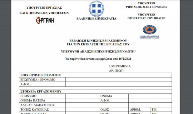 Από χθες, 26 Μαρτίου 2021, μπορούν να εκδίδονται βεβαιώσεις κίνησης εργαζομένων, ελεύθερων επαγγελματιών, αυτοαπασχολούμενων-επιτηδευματιών και μελών οργάνων διοίκησης, με ημερομηνία ισχύος έως και τις 9/4/2021.