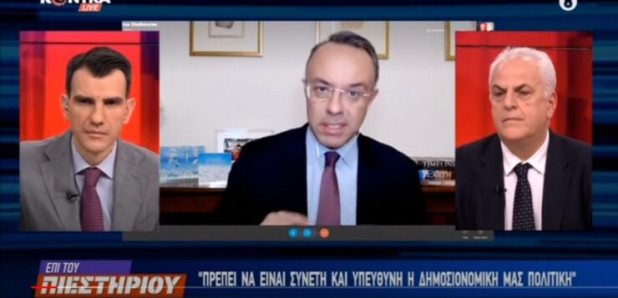 Ουπουργός Οικονομικών Χρήστος Σταϊκούρας απάντησε στο ερώτημα των Γιώργου Σιαδήμα και Βασίλη Σκουρή στην εκπομπή «Επί του Πιεστήριου» στο Kontra για το αν υπάρχει δημοσιονομικός χώρος κατά την εκτέλεση του προϋπολογισμού για την καταβολή του έκτακτου επιδόματος Πάσχα στα ευάλωτα νοικοκυριά, μετά τα όσα συμβαίνουν στην Ουκρανία.