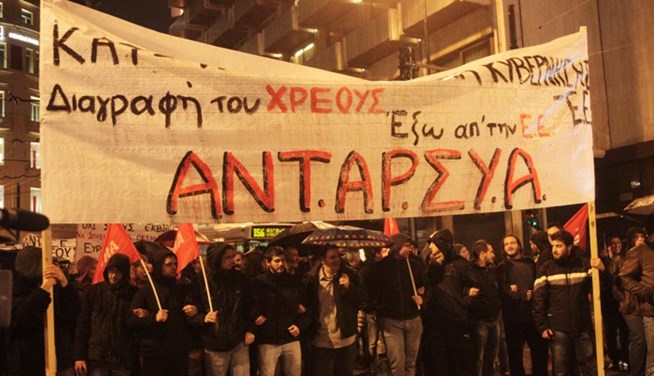 Συγκέντρωση διαμαρτυρίας πραγματοποίησαν η ΑΝΤΑΡΣΥΑ, το ΕΠΑΜ και Συνεργατικό Εργατικό Κόμμα, σήμερα το απόγευμα στην πλατεία Συντάγματος κατά της συμφωνίας με τους δανειστές και κατά της παράτασης της δανειακής σύμβασης.