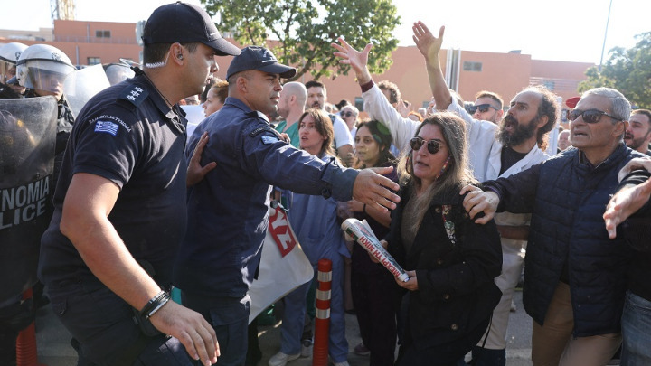 «Καταγγέλλουμε την καταστολή σε βάρος της κινητοποίησης των υγειονομικών εδώ στο Αττικόν, εδώ που το υπουργείο "Εμπορίου της Υγείας", με την παρουσία του πρωθυπουργού, ετοιμάζει μία ακόμη φιέστα για να ανοίξουν - υποτίθεται - την καινούργια πτέρυγα στα Τμήματα Επειγόντων Περιστατικών και μια άλλη ακόμα πτέρυγα.
