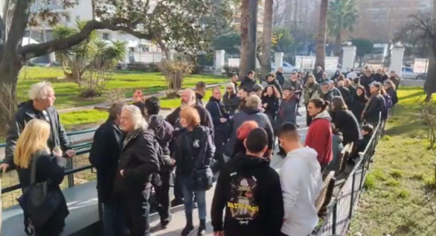 Έξω από τα δικαστήρια του Βόλου είναι συγκεντρωμένοι πολίτες που φωνάζουν συνθήματα κατά της Αστυνομίας, του Αχιλλέα Μπέου και της ΑΓΕΤ.