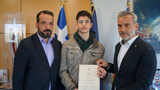 Τον 18χρονο φοιτητή από την Κρήτη υποδέχτηκαν στο δημαρχιακό μέγαρο ο δήμαρχος Θεσσαλονίκης Κωνσταντίνος Ζέρβας και ο πρόεδρος του Δημοτικού Συμβουλίου Πέτρος Λεκάκης και του παρέδωσαν τιμητική διάκριση.