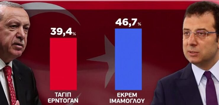 Λίγο μεγαλύτερο ποσοστό συγκεντρώνει ο Τούρκος πρόεδρος, 39,4%, που δεν του δίνει όμως την πρωτιά, σε σύγκριση με τον Εκρέμ Ιμάμογλου, δήμαρχο της Κωνσταντινούπολης, επίσης εκλεγμένο με το Ρεπουμπλικανικό Λαϊκό Κόμμα (CHP), ο οποίος συγκεντρώνει το 46,7% των ψήφων.