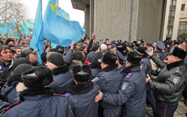 Περί τους εκατό αστυνομικοί έχουν αναπτυχθεί μπροστά από το κτίριο του κοινοβουλίου, όπου συνεπλάκησαν χθες μέλη της ταταρικής κοινότητας, υποστηρικτές της νέας ουκρανικής ηγεσίας, και φιλορώσοι υποστηρικτές της απόσχισης της Κριμαίας.