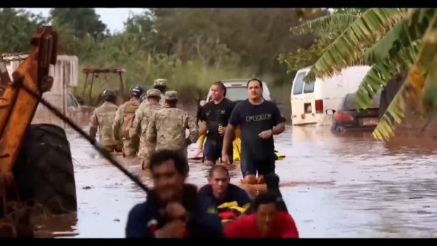 Εναέρια πλάνα από το νησί Οάχου καταγράφουν πλημμυρισμένες αγροτικές εκτάσεις κοντά στη θάλασσα και δρόμους που έχουν καταρρεύσει από τη δύναμη των υδάτων. Στην περιοχή Waialua, μέλη της Εθνοφρουράς της Χαβάης, σε συνεργασία με τοπικές αρχές και συνεργεία του δήμου, επιχειρούν μέσα σε νερά και λάσπη, συνδράμοντας στις επιχειρήσεις διάσωσης και αποκατάστασης.
