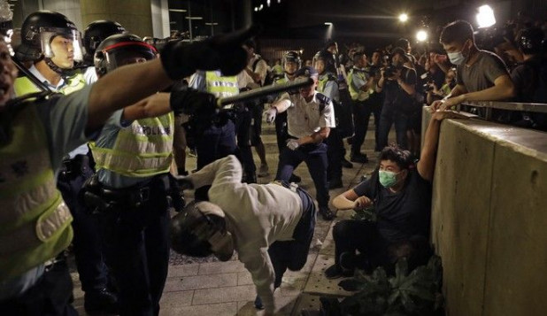 Διαδηλωτές πέταξαν μπουκάλια και χρησιμοποίησαν μεταλλικά φράγματα κατά της αστυνομίας, η οποία με ρόπαλα και αέριο πιπεριού, προσπαθούσε να εκδιώξει μια μικρή ομάδα που ήθελε να μείνει μπροστά από το νομοθετικό συμβούλιο, το τοπικό "κοινοβούλιο", σύμφωνα με δημοσιογράφο του AFP.