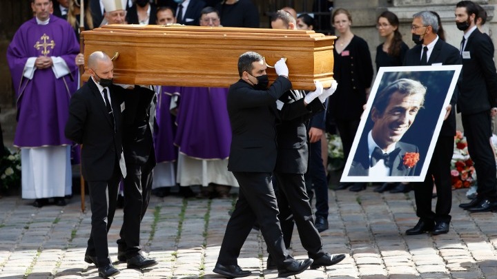 Εκατοντάδες άνθρωποι συγκεντρώθηκαν πίσω από τις μπάρες ασφαλείας γύρω από την εκκλησία Σεν-Ζερμέν-ντε-Πρε, στο κέντρο του Παρισιού ή κάθονταν στους υπαίθριους χώρους των διάσημων καφέ της συνοικίας, χειροκροτώντας την άφιξη της νεκροφόρας που μετέφερε το φέρετρο του Μπελμοντό.