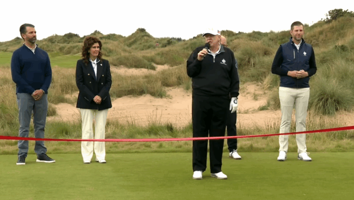 Λίγο νωρίτερα, ο ήχος της γκάιντας δονούσε το εντυπωσιακό τοπίο με τους αμμόλοφους στις όχθες της Βόρειας Θάλασσας, ενώ ο Ρεπουμπλικάνος πρόεδρος υπενθύμιζε τους οικογενειακούς δεσμούς του με τη Σκωτία, τη γενέτειρα της μητέρας του. «Θέλαμε εδώ να γίνει το πιο απίστευτο γήπεδο γκολφ στον πλανήτη. Και δεν υπάρχει αμφιβολία ότι αυτό επιτεύχθηκε» είπε ο γιος του, ο Έρικ Τραμπ.