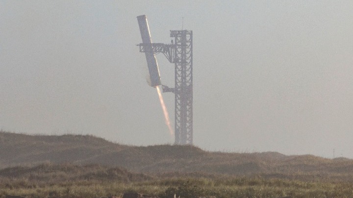 Ωστόσο ο μεγάλος προωθητήρας του πυραύλου, ο Super Heavy, επέστρεψε στην εξέδρα εκτόξευσης περίπου επτά λεπτά μετά την εκτόξευση, όπως ήταν σχεδιασμένο, επιβραδύνοντας την κάθοδό του από το διάστημα με χρήση των κινητήρων Raptor και εκτελώντας έναν περίπλοκο ελιγμό ώστε να αγκιστρωθεί από γιγάντιους μεταλλικούς βραχίονες οι οποίοι ήταν προσαρμοσμένοι σ' έναν πύργο εκτόξευσης.
