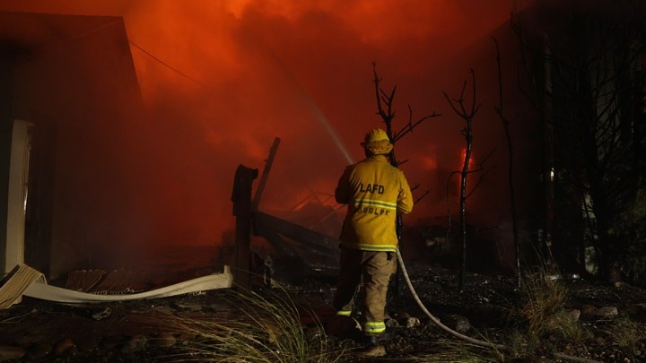 Οι πυρκαγιές, που μαίνονται στην περιοχή του Λος Άντζελες, επιδεινώνονται από τους θερμούς και ξηρούς ανέμους Σάντα Άνα, ένα μετεωρολογικό φαινόμενο που προκαλεί μεγάλη ξηρασία.