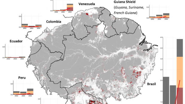 Σύμφωνα με τη μελέτη ερευνητών του Κοινού Κέντρου Ερευνών της Ευρωπαϊκής Επιτροπής που δημοσιεύθηκε στο περιοδικό «Biogeosciences», 3,3 εκατομμύρια εκτάρια δάσους στον Αμαζόνιο επηρεάστηκαν από πυρκαγιές μόνο κατά το περασμένο έτος. Αυτή η αύξηση φαίνεται να οφείλεται σε έναν συνδυασμό ακραίας ξηρασίας που επιδεινώνεται από την κλιματική αλλαγή, κατακερματισμού του δάσους και κακής διαχείρισης γης (π.χ. ανεξέλεγκτες φωτιές ή εμπρησμοί από καταπατητές), οδηγώντας σε σημαντική υποβάθμιση του δάσους. Στην ανάλυση που καλύπτει την περίοδο 2022-2024, η υποβάθμιση λόγω πυρκαγιών ξεπέρασε για πρώτη φορά την αποψίλωση ως κύρια αιτία εκπομπών διοξειδίου του άνθρακα στον Αμαζόνιο. Υπολογίζεται ότι η αύξηση των εκπομπών είναι επταπλάσια σε σχέση με τον μέσο όρο των δύο προηγούμενων ετών.