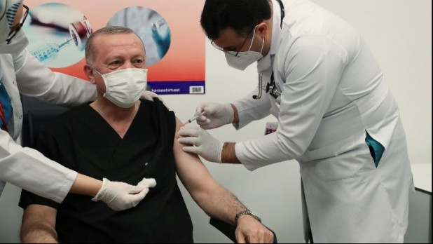Ο πρόεδρος της Τουρκίας Ρετζέπ Ταγίπ Ερντογάν έκανε σήμερα το εμβόλιο κατά της νόσου Covid-19, παρουσία του τηλεοπτικού φακού, επιχειρώντας, όπως εξήγησε ο εκπρόσωπος τύπου του κόμματός του AKP, να καθησυχάσει τις όποιες αμφιβολίες των πολιτών σχετικά με την αποτελεσματικότητα του εμβολίου.