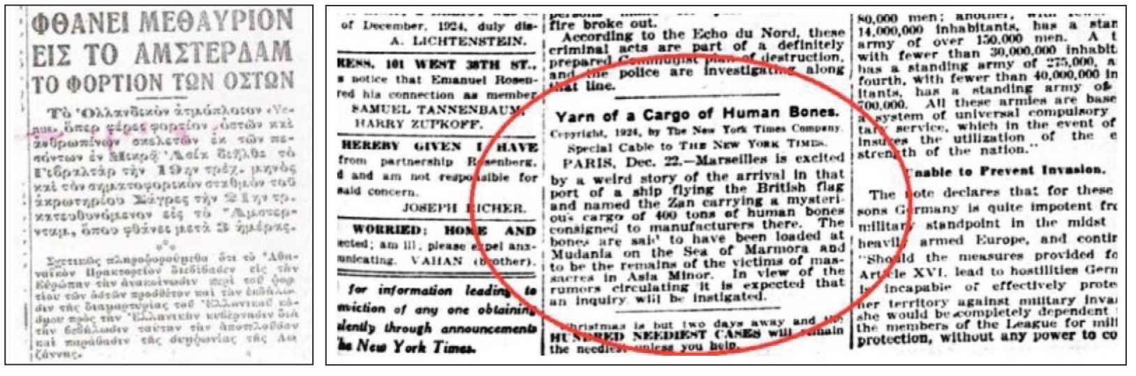 Το θέμα φαίνεται ότι έγινε γνωστό και προκάλεσε έκπληξη σε κάποιους κύκλους. Η εφημερίδα New York Times τον Δεκέμβριο του 1924 παρουσιάζει την είδηση σε ένα άρθρο με τίτλο « μια απίθανη ιστορία από ένα φορτίο με ανθρώπινα οστά»: «Η Μασσαλία είναι σε αναταραχή από μια ασύλληπτη ιστορία που (οφείλεται) στην άφιξη στο λιμάνι ενός πλοίου που φέρει βρετανική σημαία και ονομάζεται «Ζαν» και μεταφέρει ένα μυστήριο φορτίο 400 τόνων ανθρωπίνων οστών για να χρησιμοποιηθούν στις βιομηχανίες. Λέγεται ότι τα οστά φορτώθηκαν στα Μουδανιά, στη θάλασσα του Μαρμαρά και είναι τα απομεινάρια θυμάτων από τις σφαγές στη Μικρά Ασία. Ενόψει της φήμης που κυκλοφορεί αναμένεται να διαταχθεί έρευνα». Για το ίδιο θέμα η γαλλική εφημερίδα Midi έχει τίτλο τη φράση, «Πένθιμο Φορτίο» και γράφει: «Συζητιέται πολύ στη Μασσαλία η προσεχής άφιξης του πλοίου μεταφοράς εμπορευμάτων ‘Ζαν’, που μεταφέρει για τις βιομηχανίες της Μασσαλίας 400 τόνους ανθρώπινα λείψανα. Αυτά προέρχονται από τα στρατόπεδα της αρμενικής σφαγής στην Τουρκία και στην Μικρά Ασία κυρίως».
