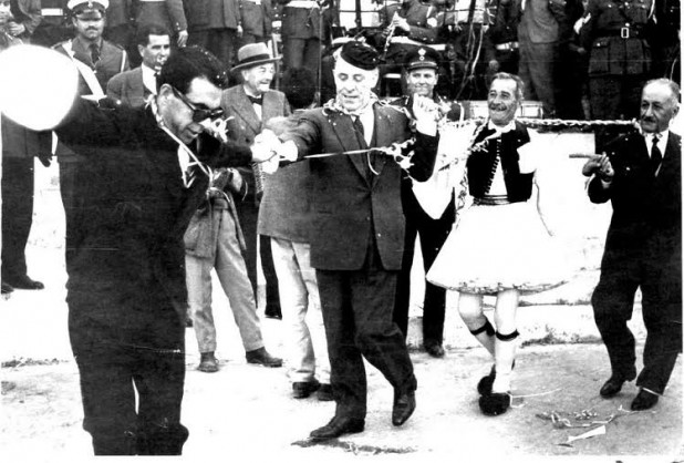 Ο Φθιώτης (Μεγάλη Κάψη) προχουντικά Υπουργός Δημόσιας Τάξης Βαγγέλης Καλαντζής, ρέκτης της δημοτικής μουσικής, κρατάει στο χορό τον τότε Δήμαρχο Αμφίκλειας για έναν τσάμικο!! στο Δαδί υπό τους ήχους φιλαρμονικής της Χωροφυλακής και υπό το βλέμμα υπομοιράρχου! (Ph1)
