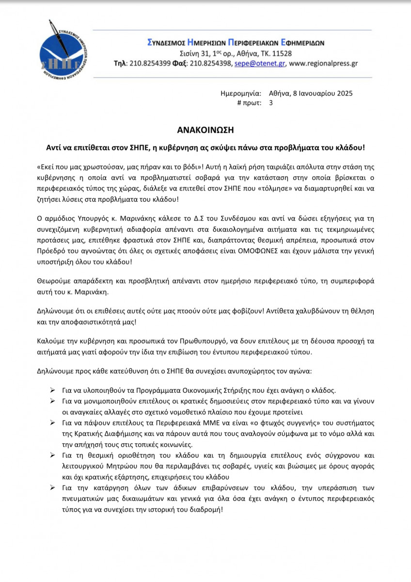 Μας προβληματίζει η συμπεριφορά του αρμόδιου υπουργού για τον Τύπο κ. Π. Μαρινάκη στη σύσκεψη που είχε προ ημερών με τα μέλη του Δ.Σ. του Σ.Η.Π.Ε., όπως φαίνεται από την ανακοίνωσή τους.