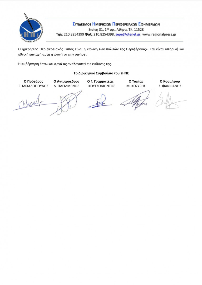 Ο Αξιότιμος πρωθυπουργός κ. Κυριάκος Μητσοτάκης, ο αρμόδιος υπουργός κ. Παύλος Μαρινάκης και η κυβέρνηση πρέπει να συνειδητοποιήσουν ότι από την στιγμή που με νόμους, μας έχουν υποχρεώσει να πληρώνουμε στον ΕΔΟΕΑΠ 2% χαράτσι επί του τζίρου των επιχειρήσεών μας (το ψήφισε και η Ν.Δ. επί κυβέρνησης Τσίπρα), πέρα από τις ασφαλιστικές εισφορές στον ΕΔΟΕΑΠ και στον ΕΦΚΑ, τις υποχρεωτικές θέσεις Δημοσιογράφων και άλλου προσωπικού στις εφημερίδες, δεν μπορούν να αδιαφορούν για την κατάσταση που επικρατεί στον Ημερήσιο Περιφερειακό Τύπο.