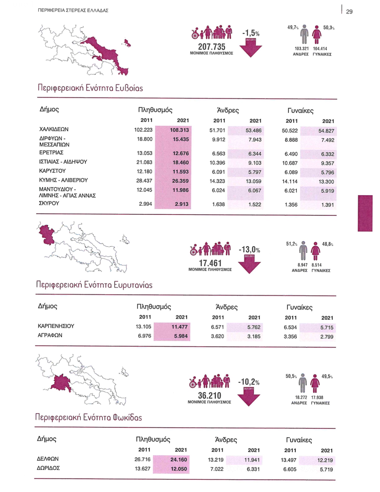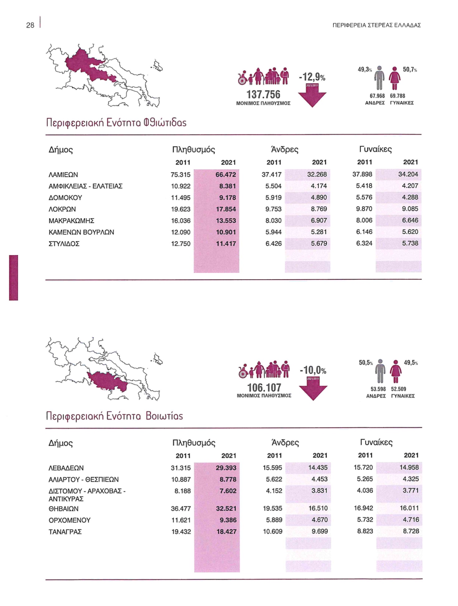 Στην Περιφέρεια Στερεάς Ελλάδας η μείωση του πληθυσμού ηταν ποσοστιαία 7,7%, έχει σήμερα 505.269 κατοίκους από τους 578.955 που είχε πριν από 10 χρόνια.
