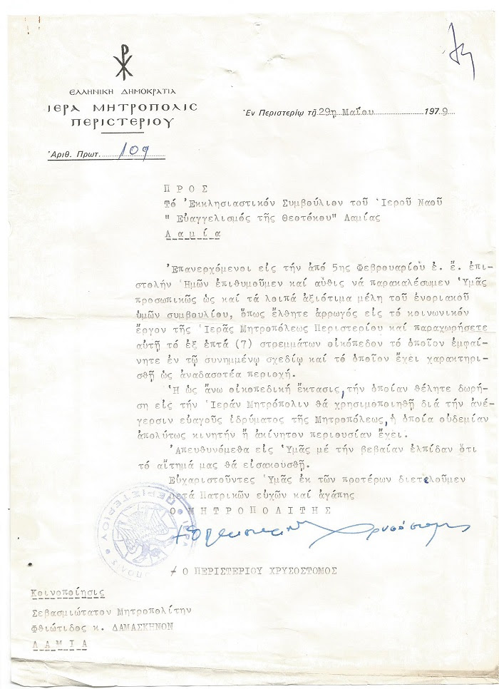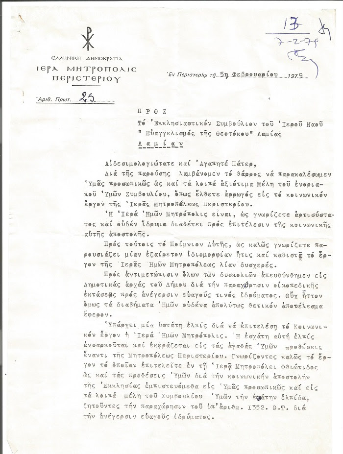 Σε τεράστια κτητορική πλάκα στο Γηροκομείο της Μητροπόλεώς σας μεταξύ άλλων γράφετε, ότι το οικόπεδο «το Ελληνικό Δημόσιον προφρόνως παρεχώρησεν». Τότε οι παρακλητικές επιστολές σας της 5ης Φεβρουαρίου 1979 και 29 Μαΐου 1979 προς το Εκκλησιαστικό Συμβούλιο του Ιερού Ναού του Ευαγγελισμού της Θεοτόκου Λαμίας για να σας παραχωρήσει 8 στρέμματα για την ανέγερση Γηροκομείου, γιατί εστάλησαν; (Σας αποστέλλουμε αντίγραφα των δύο επιστολών σας).