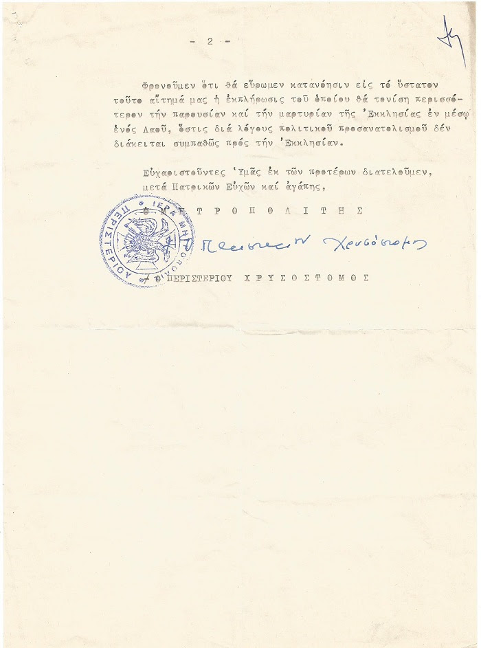 Στην επιστολή προς τον Μητροπολίτη Περιστερίου κ.κ. Χρυσόστομον η οποία υπογράφεται από τον πρόεδρο του Εκκλησιαστικού Συμβουλίου πατέρα Νεόφυτο Ραφαηλίδη αναφέρονται τα εξής :