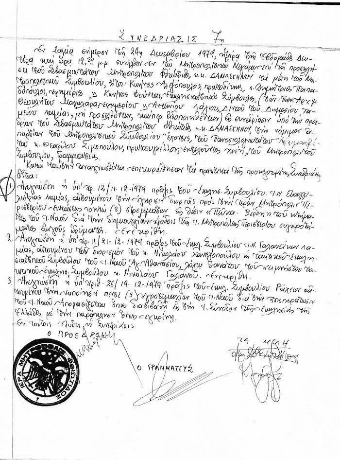 Σας συναποστέλλουμε το πρακτικό του Μητροπολιτικού Συμβουλίου (7η Συνεδρία 24 Δεκεμβρίου 1979) με το οποίο εγκρίνεται η παραχώρηση 8 στρεμμάτων στην περιοχή «Πεύκα Βέρδη» για την ανέγερση ευαγούς Ιδρύματος.
