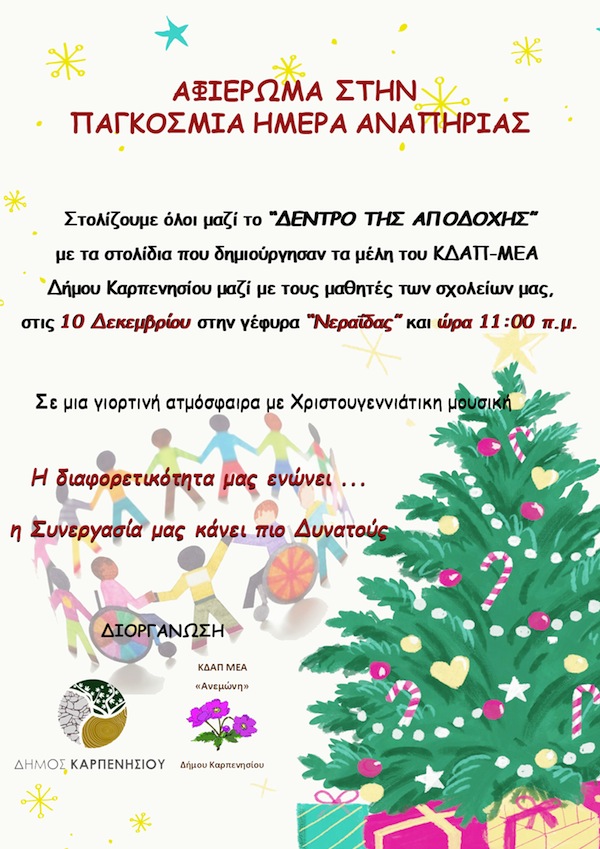 Ο Δήμος Καρπενησίου, σε συνεργασία με τα ΚΔΑΠ ΜΕΑ Ανεμώνη του Δήμου Καρπενησίου, σε μια γιορτινή ατμόσφαιρα με Χριστουγεννιάτικη μουσική, στολίζουν το “Δέντρο της αποδοχής” με τα στολίδια που δημιούργησαν τα μέλη του ΚΔΑΠ-ΜΕΑ του Δήμου Καρπενησίου, στις 10 Δεκεμβρίου, στη γέφυρα Νεράιδας, στις 11 το πρωί.