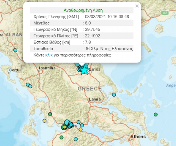 Σύμφωνα με τα τελευταία στοιχεία από το Γεωδυναμικό Ινστιτούτο, ο σεισμός είχε μέγεθος 6 Ρίχτερ, πραγματοποιήθηκε 16 χλμ. νότια της Ελασσόνας και είχε εστιακό βάθος 7,8 χιλιόμετρα.