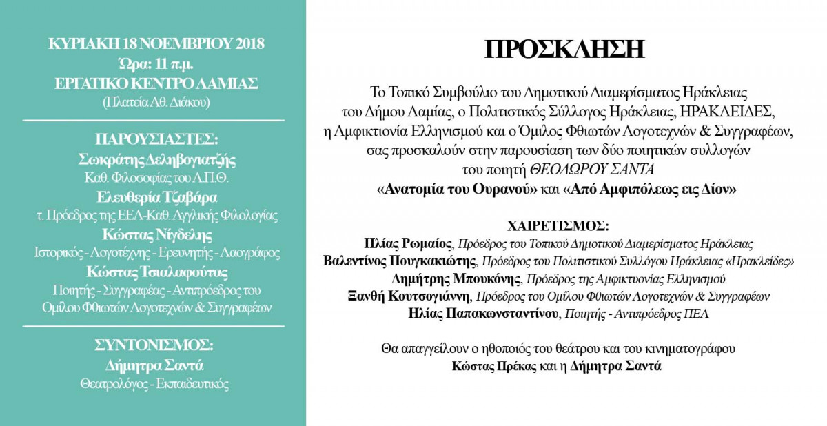 Το Τοπικό Συμβούλιο του Δημοτικού Διαμερίσματος Ηράκλειας του Δήμου Λαμίας, ο Πολιτιστικός Σύλλογος Ηράκλειας και η Αμφικτυονία Ελληνισμού παρουσιάζουν τις δύο ποιητικές συλλογές του ποιητή Θεόδωρου Σαντά “Ανατομία του Ουρανού” και “Απο Αμφιπόλεως εις Δίον”, σε εκδήλωση που θα πραγματοποιηθεί την Κυριακή 18 Νοεμβρίου (11 π.μ.) στο Εργατικό Κέντρο Λαμίας.