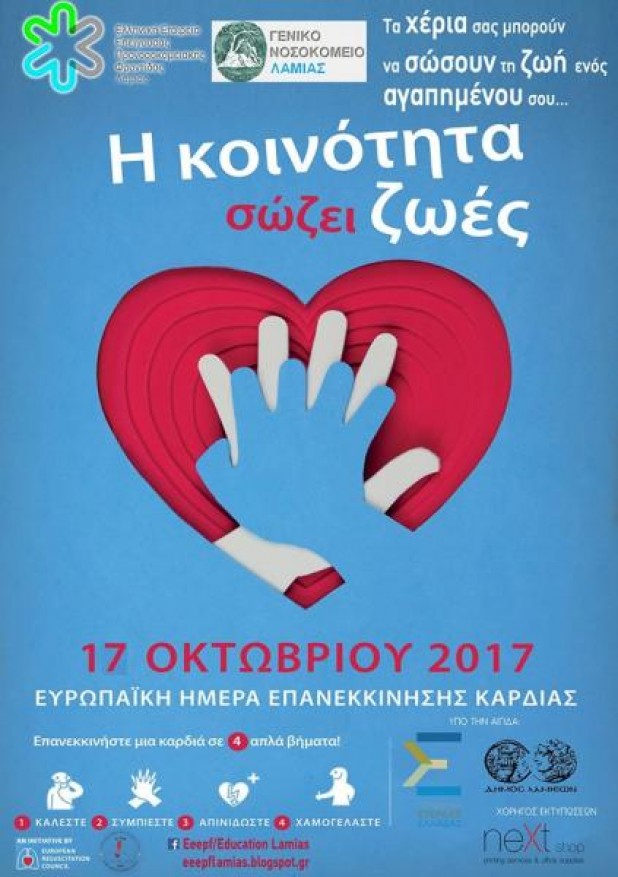 Εκδήλωση ενημέρωσης και εκπαίδευσης των πολιτών σε δεξιότητες Καρδιοπνευμονικής Αναζωογόνησης διοργανώνουν την Τρίτη 17 Οκτωβρίου, από τις 10:00π.μ. έως τις 14:00 στην πλατεία Ελευθερίας , ο Δήμος Λαμιέων, η Περιφέρεια Στερεάς Ελλάδος, η Ελληνική Εταιρία Επείγουσας Προνοσοκομειακής Φροντίδας (Ε.Ε.Ε.Π.Φ) και το Γενικό Νοσοκομείο Λαμίας .