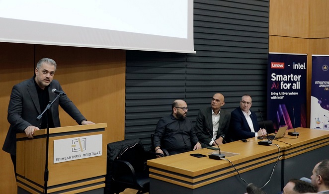 Οι εισηγητές κ. Γεράσιμος Κοτσώνης, Sales Manager της Lenovo, και κ. Θάνος Κακαρούντας, Καθηγητής και Πρόεδρος του Τμήματος Πληροφορικής με Εφαρμογές στη Βιοϊατρική του Πανεπιστημίου Θεσσαλίας, παρουσίασαν τις τάσεις και τις εφαρμογές της Τεχνητής Νοημοσύνης στον επιχειρηματικό και ακαδημαϊκό χώρο.