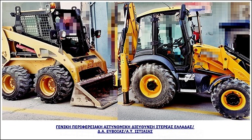 Από αστυνομικούς του Αστυνομικού Τμήματος Ιστιαίας, μετά από κατάλληλη αξιοποίηση στοιχείων, εξιχνιάσθηκαν δύο (2) κλοπές μηχανημάτων έργων, τα οποία στο πλαίσιο της αστυνομικής έρευνας, εντοπίσθηκαν και κατασχέθηκαν χθες (04-04-2022) μεσημβρινές ώρες, στην περιοχή της Ιστιαίας Ευβοίας.