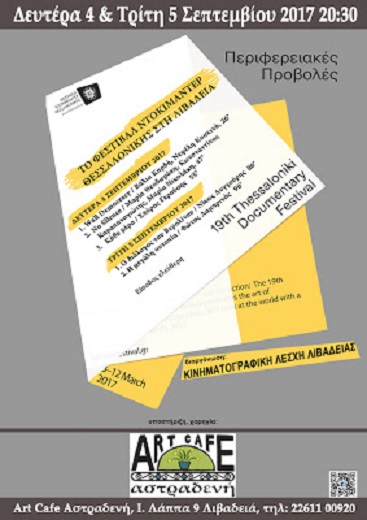 Το Φεστιβάλ Ντοκιμαντέρ Θεσσαλονίκης αναγνωρίζοντας την ανάγκη για την περαιτέρω προβολή του ντοκιμαντέρ εντάσσει στον ετήσιο προγραμματισμό του τη διοργάνωση προβολών σε πόλεις της Ελλάδας και του εξωτερικού. Φέτος – για 3η χρονιά - εντάχθηκε και η Λιβαδειά στον κατάλογο των πόλεων. Οι υπαίθριες προβολές διοργανώνονται από την Κινηματογραφική Λέσχη Λιβαδειάς την Δευτέρα 3/9 και Τρίτη 4/9, δίπλα στο ποτάμι, έξω από το Art Cafe Αστραδενή. Θα παρουσιαστούν βραβευμένα ντοκιμαντέρ του 19ου Φεστιβάλ Ντοκιμαντέρ Θεσσαλονίκης.