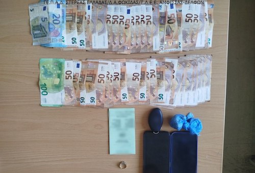 Έπειτα από κατάλληλη αξιοποίηση στοιχείων και δεδομένων που προέκυψαν από την ενδελεχή προανακριτική διαδικασία, με την συνδρομή Αστυνομικών της Κ.Α.Μ. της Διεύθυνσης Αστυνομίας Φωκίδας, ακινητοποιήθηκε Ι.Χ.Ε. αυτοκίνητο, στο οποίο επέβαιναν οι ανωτέρω και κατά τον έλεγχο που ακολούθησε βρέθηκαν και κατασχέθηκαν: 2 αυτοσχέδιες νάιλον συσκευασίες, περιέχουσες κάνναβη συνολικού μικτού βάρους -8,4- γραμμαρίων, ένας σταυρός με αλυσίδα, ένα χρυσό δαχτυλίδι καθώς και το χρηματικό ποσό των 450 ευρώ.