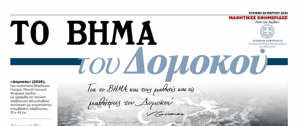 Αυτή την Κυριακή 29 Μαρτίου 2026, με το «ΒΗΜΑ της Κυριακής», κυκλοφορεί, η μαθητική εφημερίδα «ΤΟ ΒΗΜΑ του Δομοκού», σε μια ενέργεια που τελεί υπό την Αιγίδα του Υπουργείου Παιδείας, Θρησκευμάτων και Αθλητισμού.