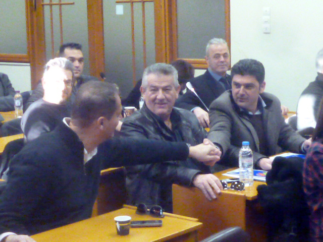 Στη φωτογραφία Χρήστος Σανίδας και Δημήτρης Κυρίτσης δίνουν τα χέρια υπο το βλέμμα του Παναγιώτη Αρβανίτη.