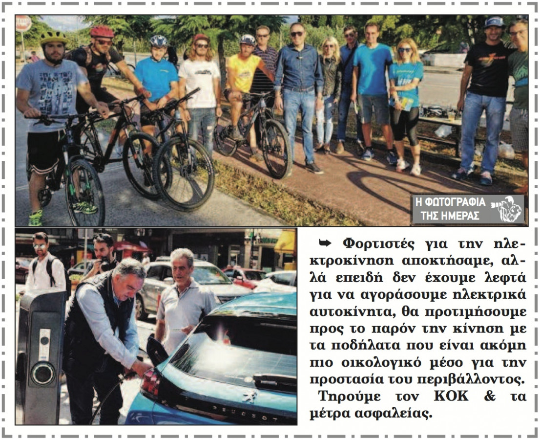 • Φορτιστές για την ηλεκτροκίνηση αποκτήσαμε, αλλά επειδή δεν έχουμε λεφτά για να αγοράσουμε ηλεκτρικά αυτοκίνητα, θα προτιμήσουμε προς το παρόν την κίνηση με τα ποδήλατα που είναι ακόμη πιο οικολογικό μέσο για την προστασία του περιβάλλοντος.